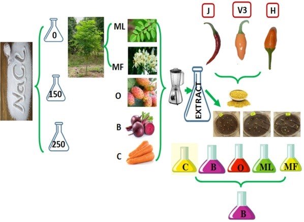 Salinity is one of the most pervasive abiotic stressors limiting global agricultural productivity, particularly by impairing seed germination in sensitive species, such as chili peppers (Capsicum spp.). This study rigorously evaluated the potential of nature-derived biostimulants to alleviate salinityinduced germination inhibition in three agronomically important Yemeni chili pepper genotypes: Haimi (H), Hajjah (J), and Jawfi3 (V3). Aqueous extracts from red beetroot, prickly pear fruit, carrot roots, and moringa leaves and flowers were subjected to an optimized 18-hour seed priming protocol. The seeds were germinated at three salinity levels (0, 150, and 250 mM NaCl) in a randomized complete block design. The results revealed a striking mitigation of salinity stress at 150 mM NaCl by all plant extracts, with substantial protective effects observed at the extreme 250 mM NaCl concentration. Notably, beetroot extract emerged as the most potent biostimulant, consistently delivering the highest Extract Stimulation Index (ESI%) across all germination parameters including germination percentage (GrP%), mean germination time (MGT), germination speed (GSC), and radicle length. Its performance was robust across all genotypes and salinity levels, thereby highlighting its broad-spectrum efficacy.