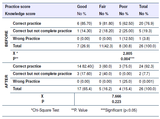 Results: HCP knowledge scores improved after the educational intervention, from 26.9% ’good’ to 65.4%. HCP practices improved, with correct practices increasing from 76.9% to 92.3% (p = 0.015). Injection safety practices did not significantly improve. General secure safety practices increased from 26.9% to 92.3% for good practices after the intervention; the statistical significance was marginal (p=0.063).